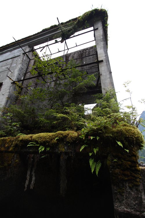 — Many decades after the miners left, moss, bushes, and trees are taking over this concrete building.