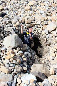 — Hui Tang helps excavate a hole into sediment deposited by the 17 Oct 2015 tsunami in Taan Fjord.