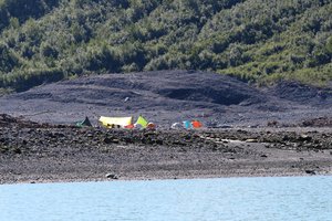 — While studying the Taan tsunami, we camped on a broad beach-like plain of sand and boulders that the tsunami left behind.