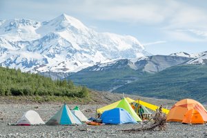 — Mount Saint Elias looms above camp. This camp-site was used for each of the three expeditions to study the landslide and tsunami in Taan Fjord in the spring and summer of 2016.