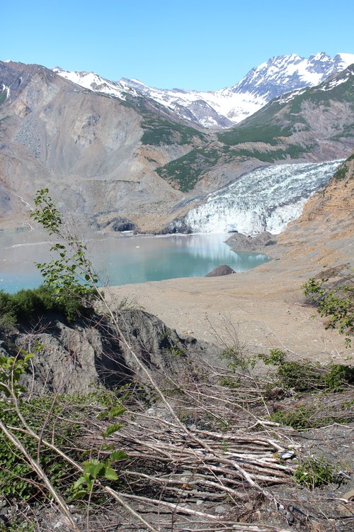— A glacier and a mountain conspire to create a tsunami that reshapes the landscape. The glacier undercut and steepened the mountain, then retreated to leave it unsupported. The mountain fell, 150 million tons of rock shooting down into the fjord at the front of the glacier. The fjord, displaced by that landslide surged uphill as a tsunami, reaching the point where this photo was taken from - about 600 feet above the water.