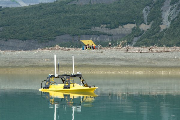 — This small, remote control boat, maps the sea floor in front of the Taan Fjord camp. This area is full of kettles and was overrun with sediment from the October, 2016 landslide generated tsunami.