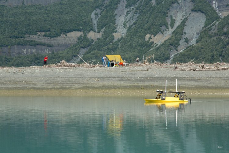 — This small, remote control boat, maps the sea floor in front of the Taan Fjord camp. This area is full of kettles and was overrun with sediment from the October, 2016 landslide generated tsunami.