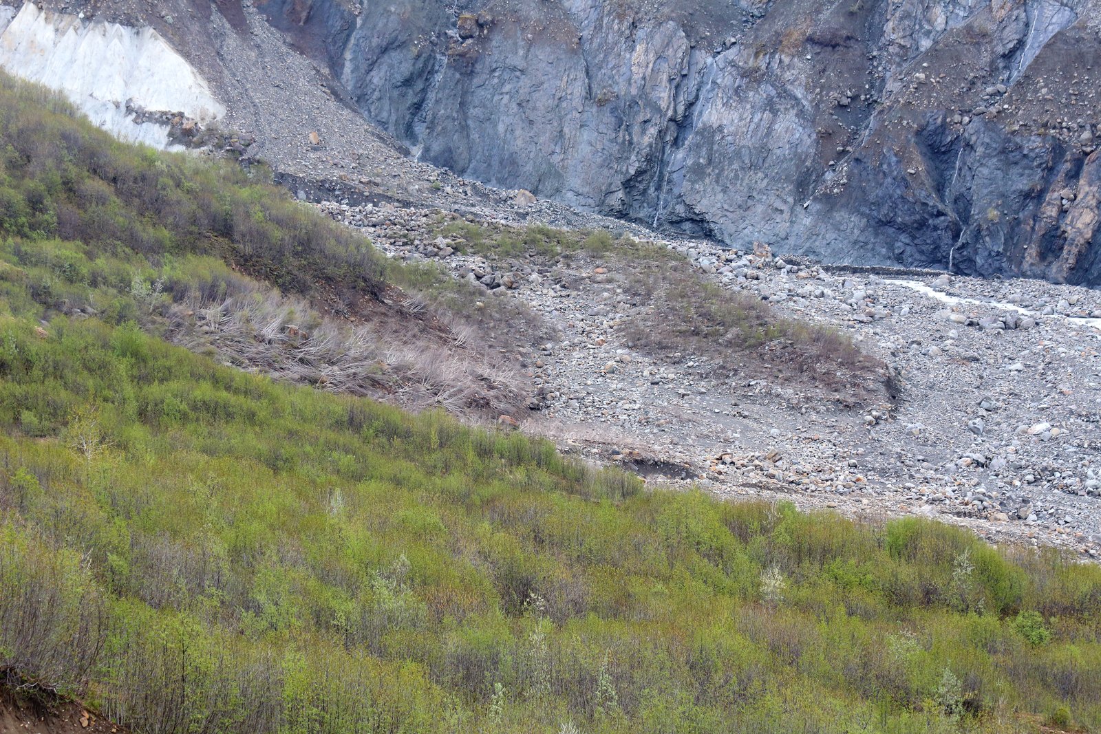 — The dead alders in this image were killed by an approximately 180 m (585 ft) tsunami that ran up into this gorge.