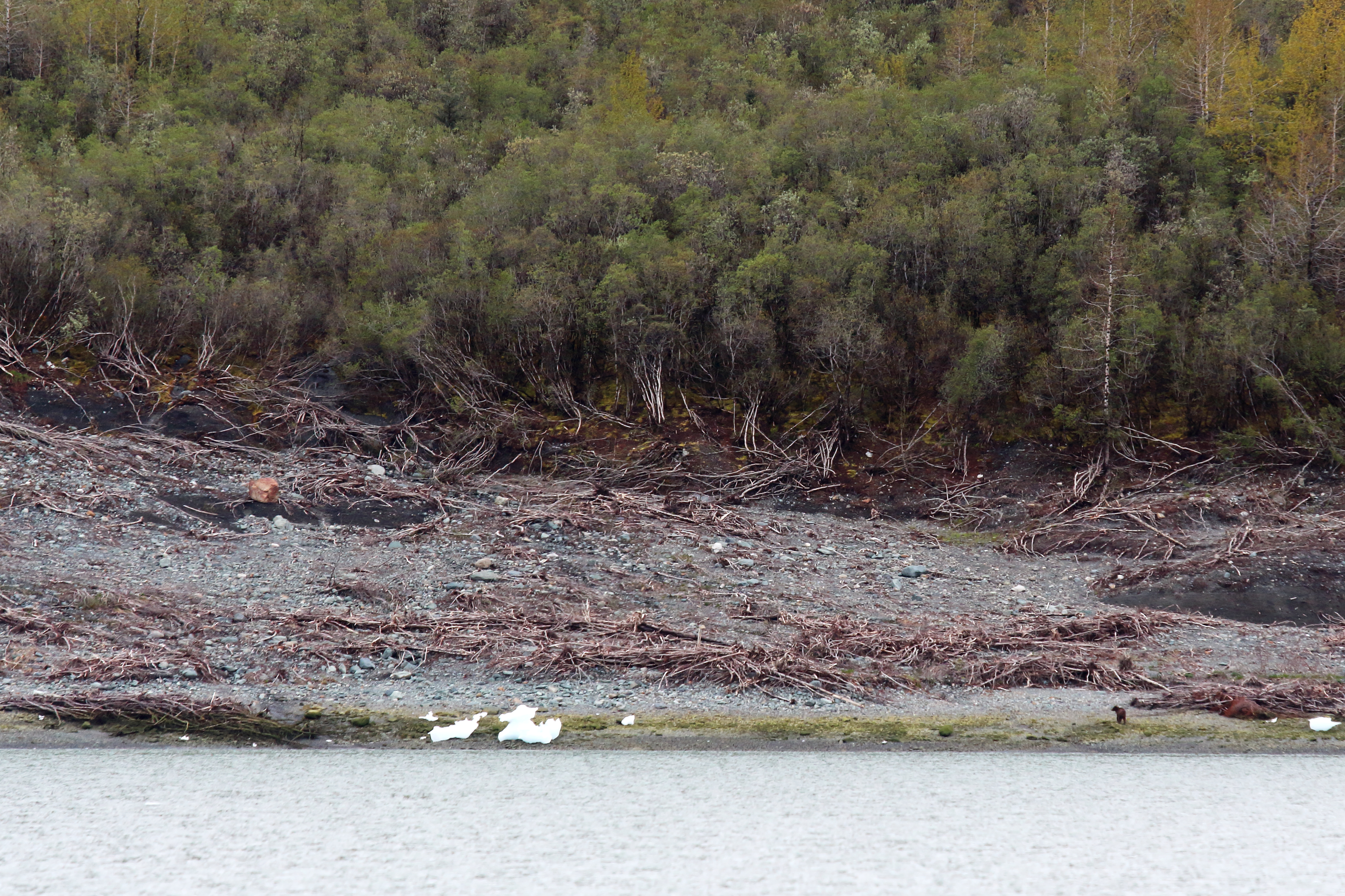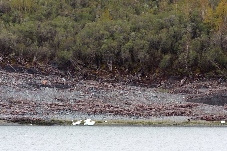 — A bear wanders along the shore of Taan Fjord, exploring areas devastated by the 17 Oct 2015 tsunami.