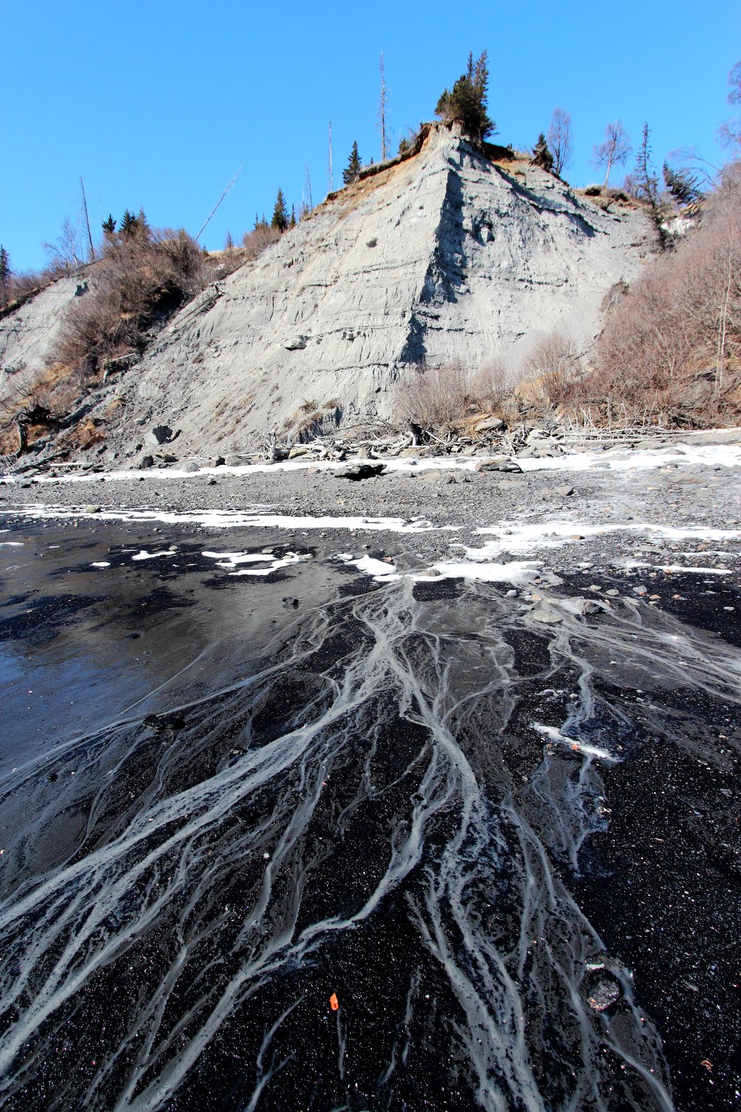 Rivulets of muddy water cross coal gravel near Homer, Alaska.