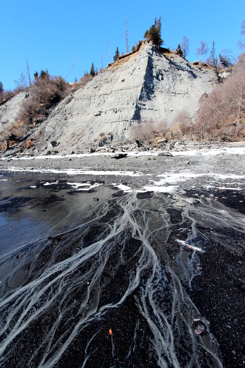 — Rivulets of muddy water cross coal gravel near Homer, Alaska.