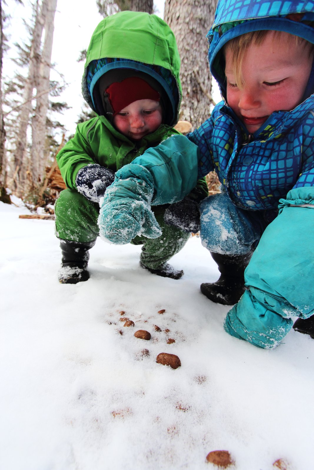 Piles of moose droppings like this proved very fascinating to Katmai and Lituya.
