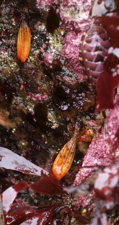 — Habitat: Rocks, pilings. Low intertidal Description: Long, yellow-brown solitary tunicate with prominent longitudinal wrinkles. Hanging from rocks by a distinct stalk. Red siphons, one straight, one curved. Notes: Could only be S. yakutatensis or S. montereyensis. Van Name says the main difference is that S. yakutatensis has a stouter stalk, not as long as the body. No real mention of S. yakutatensis anywhere else. Given location found (Yakutat), and the fact that mine do have longer bodies than stalks, I'm thinking S. yakutatensis.