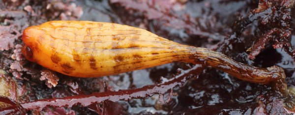 — Habitat: Rocks, pilings. Low intertidal Description: Long, yellow-brown solitary tunicate with prominent longitudinal wrinkles. Hanging from rocks by a distinct stalk. Red siphons, one straight, one curved. Notes: Could only be S. yakutatensis or S. montereyensis. Van Name says the main difference is that S. yakutatensis has a stouter stalk, not as long as the body. No real mention of S. yakutatensis anywhere else. Given location found (Yakutat), and the fact that mine do have longer bodies than stalks, I'm thinking S. yakutatensis.