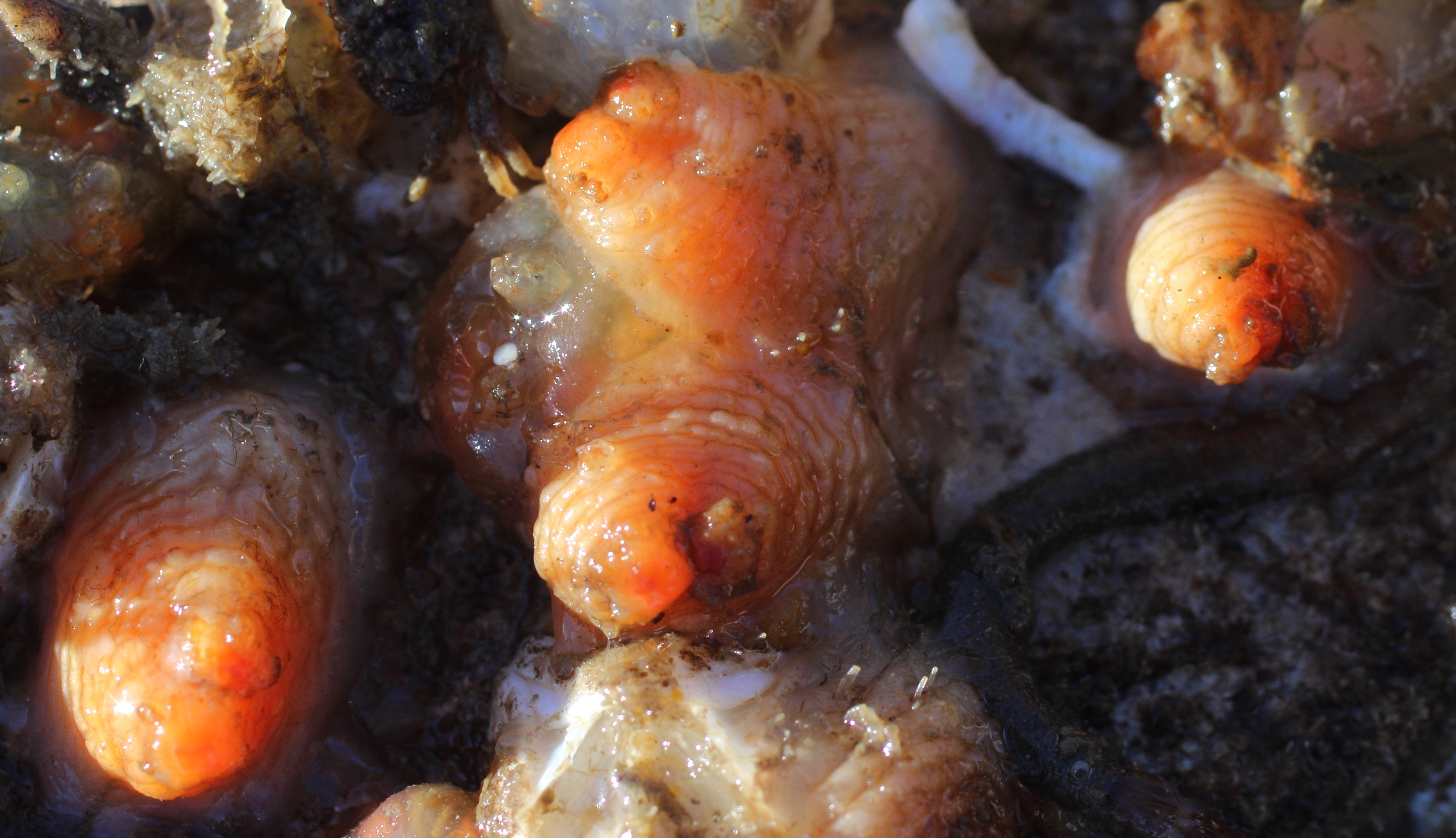 Description: No stalk, base is squat. Body is pale to orange, with prominent transverse wrinkles and no longitudinal wrinkles. Siphons are red and close together with wart-like bumps near the siphon.