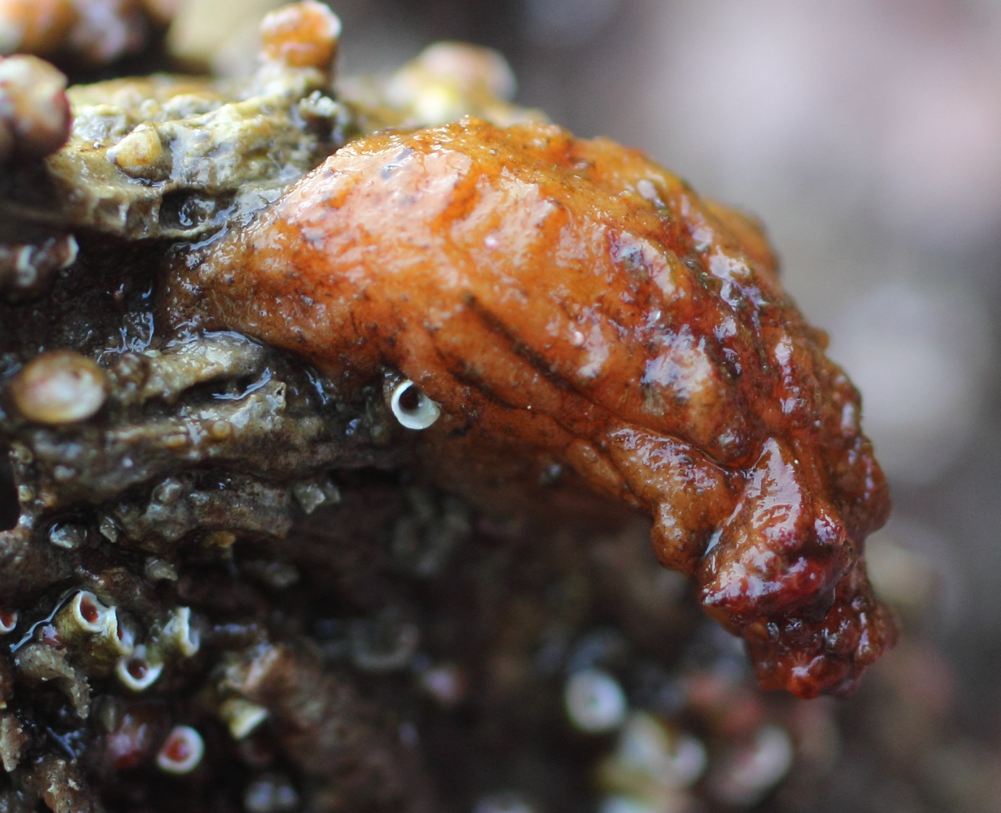 Description: Protrudes from the rocks or barnacles. No stalk, base is squat. Body is yellowish-brown, with prominent longitudinal wrinkles. No transverse wrinkles. Often prominent brownish warts on body, especially near siphons. Siphons are red and close together. One of the most common intertidal tunicates.