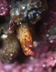 — Habitat: Rocks. Often between barnacles, doesn't mind light exposure. Mid-low intertidal, in exposed and protected areas. Description: Protrudes from the rocks or barnacles. No stalk, base is squat. Body is yellowish-brown, with prominent longitudinal wrinkles. No transverse wrinkles. Often prominent brownish warts on body, especially near siphons. Siphons are red and close together. One of the most common intertidal tunicates. Notes: Someone Catie contacted thought these were Styela gibbsii. They match the photo and description of S. gibbsii here. https://inverts.wallawalla.edu/Chordata_(Urochordata)/Class_Ascidiacea/Stolidobranchia/Styela_gibbsii.html Van Name says S. gibbsii has a narrower attachment than S. truncata, and that S. gibbsii is usually found in deeper water, while his suspicion is that S. truncata was the one that Ritter thought was common on rocks above the water line on Vancouver Island. S. truncata = S. vancouverensis. Neither S. gibbsii or S. truncata look as wrinkled or warty in his drawings as this species. This guide from SE : http://www.naturebob.com/sites/default/files/Aaron%20Baldwin%20Sealife%20of%20SE%20Alaska%2008-15-15.pdf has a species that looks the same as these listed as S. truncata. These pictures of actual sequenced specimens http://www.boldsystems.org/index.php/Taxbrowser_Taxonpage?taxid=198879 look kind of like "warty snout" and kind of like "wrinkled snout" I collected a number of these (see samples 10 and 8 from white rock beach). I know gonads are often distinctive, so they may be good candidates for dissection and/or genetics. You have a pair of photos in the S. truncata folder of a smooth elongated form that looks much more like S. truncata than mine, so I'm guessing. S. gibbsii here.