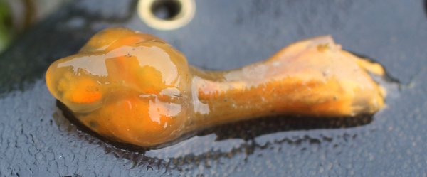 Description: Translucent tunic with bright yellow-orange zooids. Shape of each colony is something like a salmonberry, with a lobed head and a stem. Each colony consists a handful (6-12 or so) of large zooids. The base of each zooid (in the stem) expands into an opaque light yellow-white oval. The tip expands into an opaque orange-yellow oval. The middle is narrower. Sometimes many of these berry-shaped colonies grow together in a group.