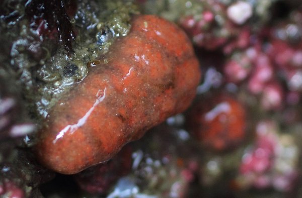 — Colonial tunicate Habitat: Rocks, low intertidal. Have found it on White Rock beach. Description: Appears like a pink conglomerate rock. Smooth surface, tunic is translucent and has embedded sand or sand-looking particles, making the tunicate appear like pink concrete. Zooids are red, and arranged very clearly in round systems. Notes: Nothing on the BC tunicate guide fits the characteristics, and I've never seen anything that looks like this in any guide.