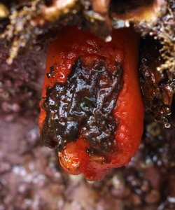 Description: Large solitary species. Bright red to orange, slightly rough skin, large siphons, droops down from rocks at low tide.