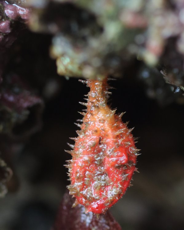 Description: Red, covered with unbranched bristles, round or oblong head attached by a long stalk, dangles down from rocks.