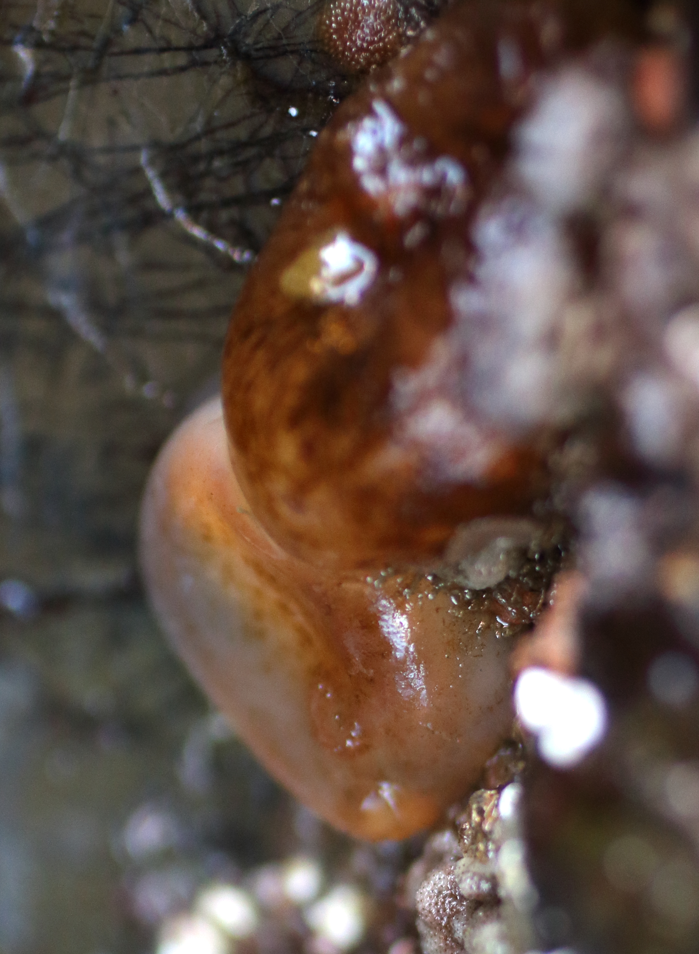 Notes: A. callosa in existing guide looks less squashed, and siphons more central/upward facing. Ascidia is the only genus I can find with this sort of sideways attachment, however. My "mushroom" may also be A. callosa, and these two groups look different to me.