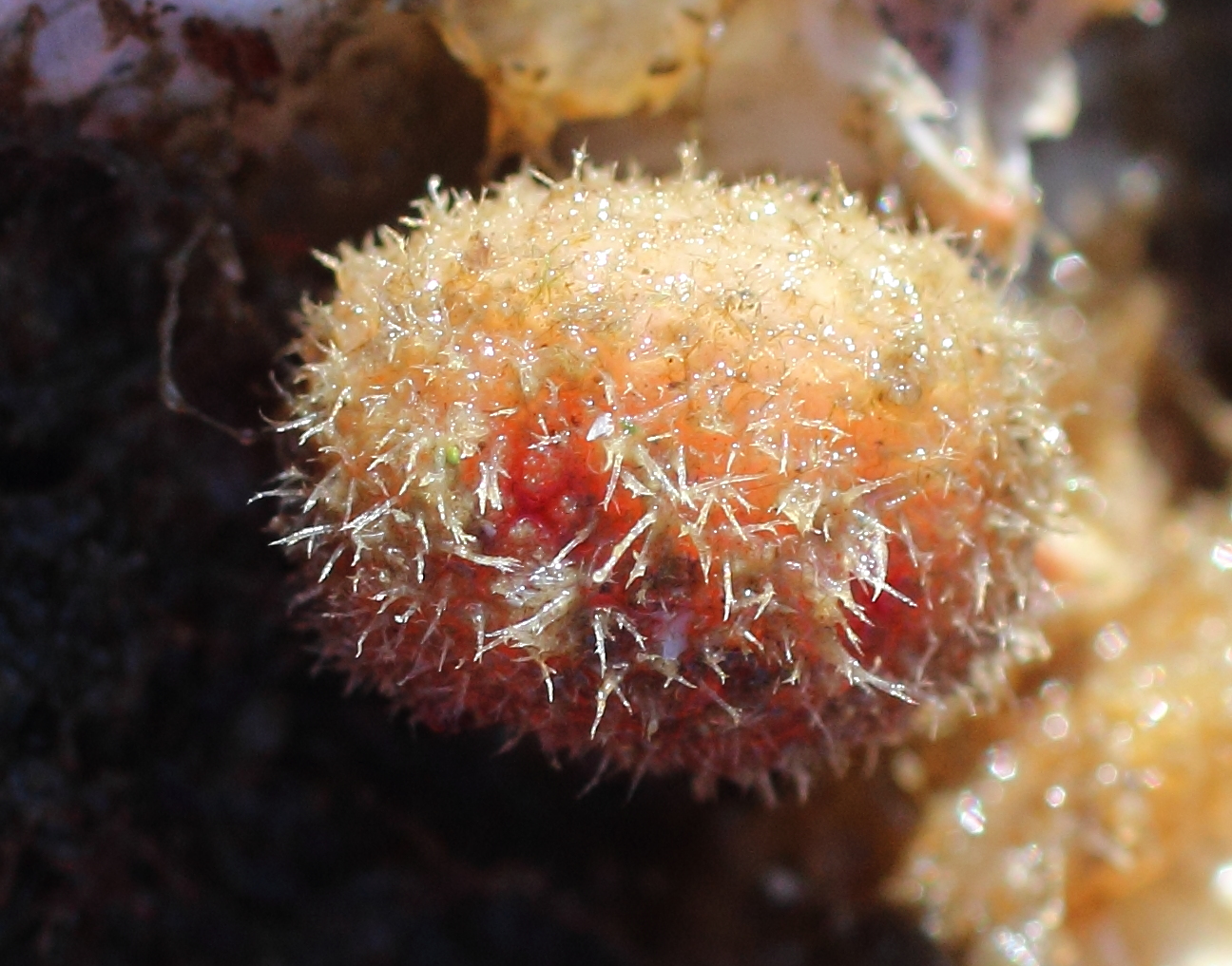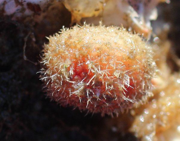 Notes: Similar to B. villosa, but the hairs of B. villosa are shorter, wider, and have no branches. B villosa is brighter red. Every B. villosa I've seen has a very obvious stalk. B. echinata is a non-stalked Boltenia whose description on the BC tunicate key seems to match the tunicate we found.