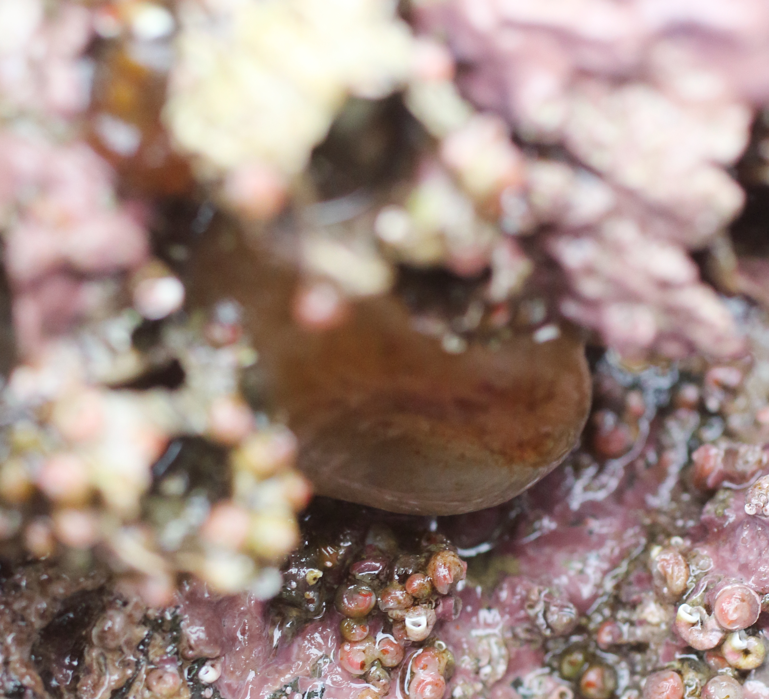 — Habitat: Rocks. Low intertidal, under overhangs. Found on Schooner Beach and Outside Beach. Description: Smooth or mostly-smooth solitary tunicate. Rounded body, squashed shape. Siphons protrude from one end of the body, as if the tunicate is attached sideways to the rock. Notes: A. callosa in existing guide looks less squashed, and siphons more central/upward facing. Ascidia is the only genus I can find with this sort of sideways attachment, however. My "mushroom" may also be A. callosa, and these two groups look different to me.