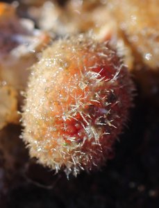 Description: Yellowish solitary tunicate, covered with hairs. Bright red siphons on top with clear four-lobed openings. Hairs are fine, and some have small branches near the end. No stalk.