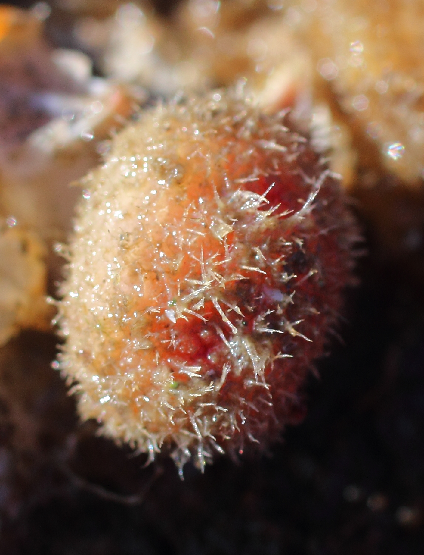 Notes: Similar to B. villosa, but the hairs of B. villosa are shorter, wider, and have no branches. B villosa is brighter red. Every B. villosa I've seen has a very obvious stalk. B. echinata is a non-stalked Boltenia whose description on the BC tunicate key seems to match the tunicate we found.