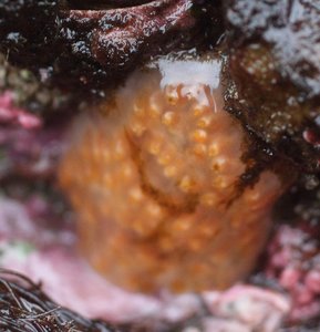 — Colonial tunicate Habitat: Rocks. Wave-exposed areas. Mid-low intertidal. Common. Locations observed: Outside beach (Summer 2016), White rock beach (Summer 2016). Description: Stiff, rubbery texture – keeps its shape when removed from rock. No stalk. Often hanging from a rock or nestled between barnacles. Zooids irregularly arranged. Tunic is more opaque than in "patches". Zooids are solid orange along their length with a whitish "skin" along the length of the tube, creating a white ring around the orange zooid tip at the surface of the colony. Notes: Some from Hesketh and Herring Islands appear to be this species, I included them in my group. This is most similar to "Patches" in photos, and the most obvious differences in the field are color and texture, where this is much more solid, and "patches" falls apart in your hand and feels more gooey. Species possibilities from online key: Aplidium solidum (redder than our photos, right texture) Aplidium californicum (paler than our photos, softer texture, range is correct). The main differences between the two on the key are that A. solidum is redder, more solid, and the zooids are arranged more irregularly. All of that seems to fit here, so I'm guessing A. solidum. I have given you a few samples of this one from Outside Beach (my samples 1-3)