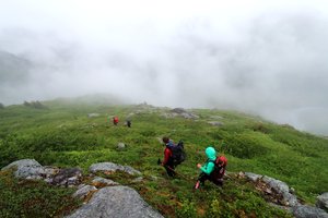 — This mix of bedrock, tundra, and low brush makes for difficulties in laying out an easily followed trail without tons of work.